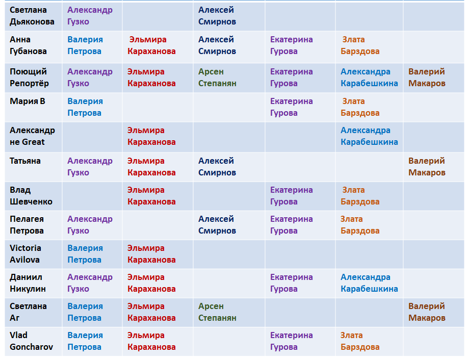 А мы смотрим шоу "Голос", к тому же сами играем. Здравствуйте! Некоторые читатели этого канала набрали "свои" команды, чтобы смотреть шоу было интереснее. Те игроки, в командах которых окажется победитель, получат диплом "Музыкальный детектив". После нокаутов мы потеряли многих участников команд. На этот момент таблица выглядит так: Ну и посмотрим, кто из конкурсантов "Голоса" дошёл до четвертьфинала. Кого из участников нет в наших командах? Кого мы проморгали? Сразу трое вокалистов могут оставить наших игроков без дипломов. Это Ксения Аксютик, Диана Дохоян, Юлия Мазунова. Если кто-то из них победит, то не видать нам дипломов как своих ушей. :-))) Но мы это точно переживём, лишь бы победа была честная. Я из той категории людей, которая ещё верит в голосования в прямом эфире. А если ни во что не верить, тогда и нет смысла смотреть подобные шоу. Весна идёт, весне дорогу! Актуальная песня у Эльмиры Карахановой. И хорошая придумка - небольшая сценка с наставником. Было интересно за эт