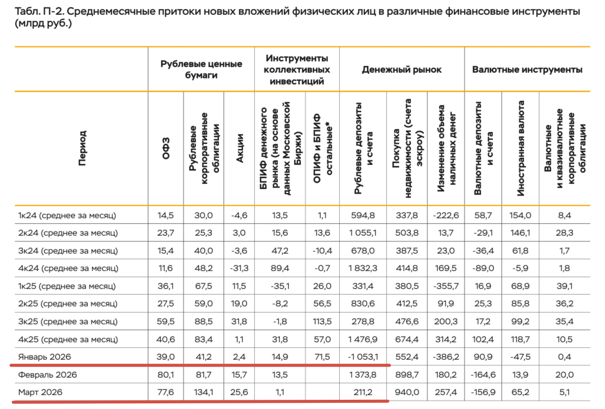 Очень долгое время, в последние годы - так точно, и я думаю, практически всегда, депозиты в банках оставались основным способом размещения свободных средств. На них в разные периоды приходилось где-то 60-80% всех новых вложений, такую статистику я не раз приводил в прежних публикациях. Но в 2026 году ситуация пока что наблюдается обратная. В два месяца из трех (январь и март) россияне понесли на фондовый рынок больше денег, чем в банки. Причем если говорить о январе, то из банков, наоборот, был огромный отток средств. В свежем "Обзоре рисков финансовых рынков" ЦБ приводит вот такую таблицу, показывающую приток новых средств физических лиц в разные финансовые инструменты. Сначала там идут среднемесячные данные поквартально за 2024-2025 годы, затем отдельно помесячные за 2026 год. Можно увидеть, что в каждом квартале 2024 и 2025 года россияне вкладывали в банки больше, чем в биржевые инструменты, причем обычно в несколько раз, а иногда - и на порядок больше, но в начале 2026 года все из