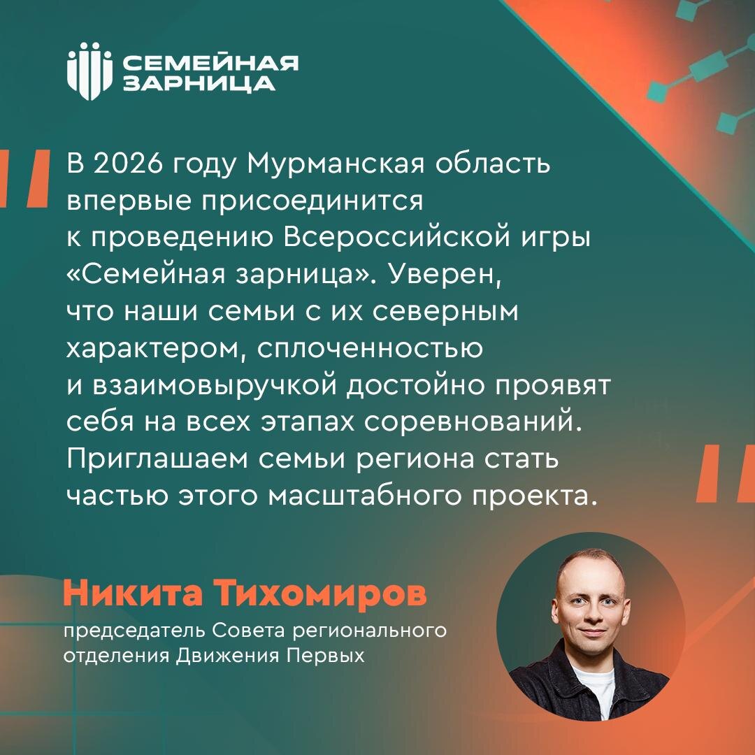 Мурманская область впервые присоединится к Всероссийской игре «Семейная зарница». Это проект для семей, где важны командный дух, поддержка и настоящие ценности — не зря девиз звучит: «Родина начинается с семьи». Участвовать смогут команды из двух взрослых и двух детей старше 11 лет. Им предстоят испытания на ловкость и смекалку, а ещё — творческий этап: нужно будет собрать модель техники и применить её в деле. 📌 Муниципальные этапы пройдут во всех 17 муниципальных образованиях Заполярья 📌 Регистрация открыта до 24 апреля на сайте — https://projects.pervye.ru/projects/cef3e7bf-8192-4a3d-9cee-87df32c8aea5 📌 Финал — в августе–сентябре, туда выйдут лучшие семьи со всей страны Северяне, это ваш шанс показать, что такое настоящая сплочённость 🔥 🔥 Подпишись на ГМО 🫱 ГМО в MAX