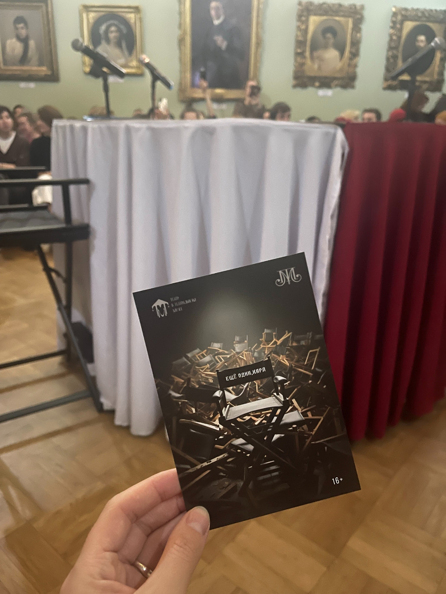 Спасибо режиссёру Диме Крестьянкину за этот вечер в Театральном музее. На спектакль я шёл расколотым на кусочки сыростью осени и прохладой ранних закатов. «Ещё один, Карл» меня будто бы пересобрал, залил сил, включил мотор. Потом, конечно, я продолжу сопливить, но пару часов было ощущение полного восстановления. Вот она — сила искусства! Это будто квартирник «для своих», для людей, с которыми было бы приятно дружить, и обсуждать его. Словно находишься в «своей стае», как сказала Тася, — очень комфортно было в этом месте, с этой публикой. Раньше мы так всегда себя чувствовали в Невидимом, пока их билеты не начали продаваться в банковских приложениях. Ещё было любимое ощущение нового: «вау, такого мы ещё не видели». Это был спектакль-подкаст. Если очень грубо, представьте театрально-исторический standup (хотя герои сидели (на стульях)) с вкраплениями этюдов. На подкастах мы до этого не бывали, а мозаичная форма постановки — наша любимая (опять привет Невидимому и Театро Ди Капуа). Смешна