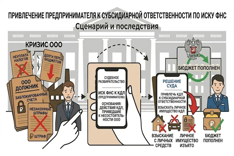 Привлечение налоговой к субсидиарной ответственности происходит по долгам перед бюджетом — это механизм, при котором задолженность перед бюджетом может быть взыскана с руководителя, участника или иного контролирующего лица. Старые схемы ухода в тень через номинальных директоров или перевод бизнеса давно не актуальны.
