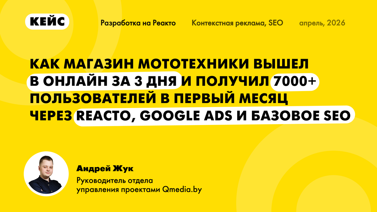 Клиент — магазин мототехники и электротранспорта exspert.by. До запуска продажи шли только офлайн: ассортимент был, спрос был, бизнес работал, но в интернете компания фактически отсутствовала. Это означало простую вещь: в тот момент, когда потенциальный покупатель искал товар в Google, сравнивал предложения, изучал модели и выбирал, куда обратиться, он находил кого угодно, только не этот магазин. Бизнес уже умел продавать, но не использовал интернет как полноценный канал получения заявок.