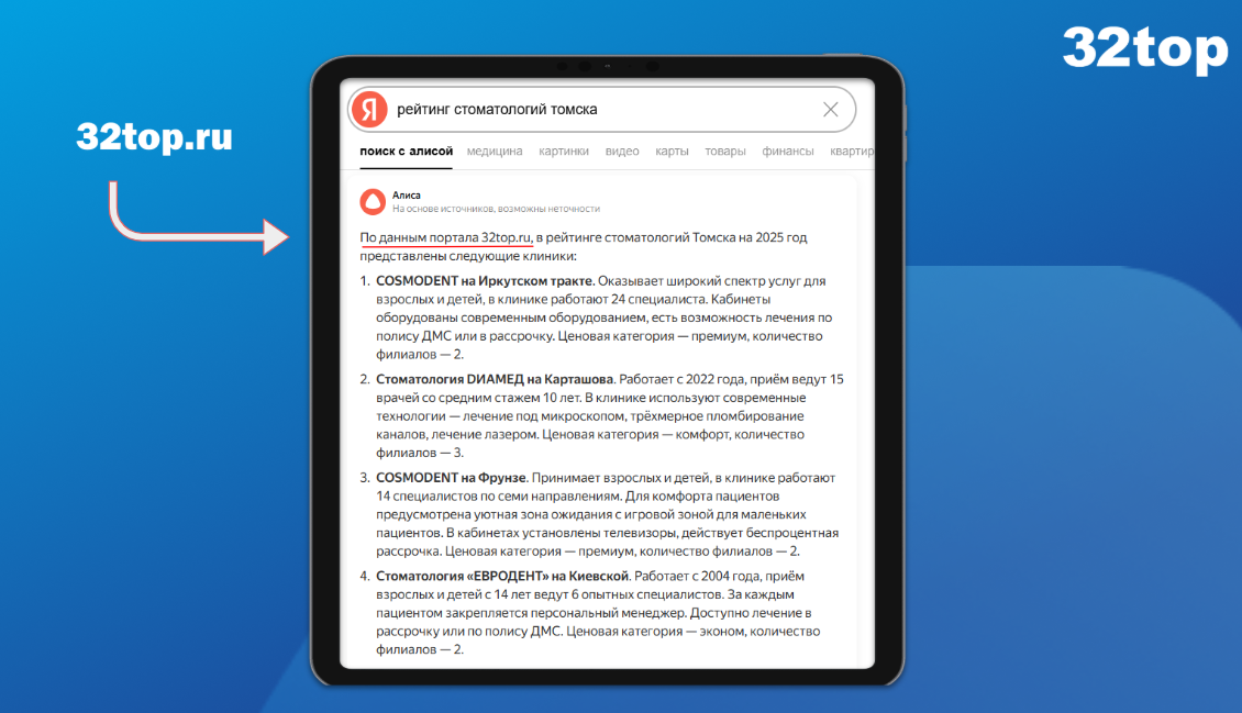 - Зарегистрироваться в профессиональных рейтингах стоматологических клиник, например в Рейтинге по версии 32top.ru