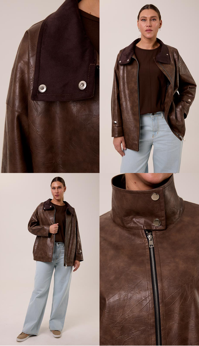 Весна 2026 окончательно закрепила тренд на кожу. Теперь брутальные кожаные куртки, бомберы, тренчи, пиджаки и косухи не кажутся чем-то "слишком". Они надолго поселились в нашем гардеробе. Но раньше считалось, что кожа только для стройных и дерзких. Стереотип, который мы разбиваем вдребезги. Современные фасоны и качественные материалы творят чудеса: кожаная куртка для леди в плюсе может стать главной инвестицией в гардероб. Она стройнит, структурирует силуэт и добавляет характера любому образу. В нашей весенней коллекции мы вы выпустили сразу 3 разные модели из эко-кожи, чтобы каждая могла найти ту, которая украсит именно её! Всем, кто устал от облегающих курток и хочет дышать. Бомбер ДОББИ особенно хорош для фигур «яблоко» и «груша», потому что объёмный верх уравновешивает бёдра и создаёт модный силуэт оверсайз. Это объёмный бомбер со спущенным плечом. Это значит, что он не сидит «внатяг», не ограничивает движения и позволяет носить под собой толстый свитер, худи или даже пиджак. Для