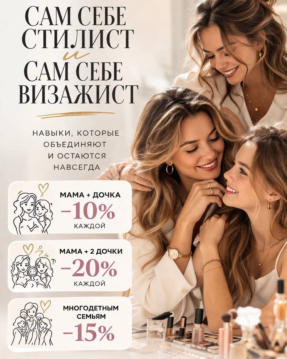 💛 Мы запустили специальное предложение на курсы «Сам себе стилист» и «Сам себе визажист» Чтобы это было не только про знания, но и про время рядом ✨ мама + дочка — скидка 10% каждой ✨ мама + 2 дочки — скидка 20% каждой ✨ для многодетных семей — скидка 15% Это больше, чем обучение Это про близость, поддержку и возможность по-новому увидеть себя и друг друга Провести время вместе и забрать с собой навык на всю жизнь Напишите «семья» – расскажем подробнее 💛