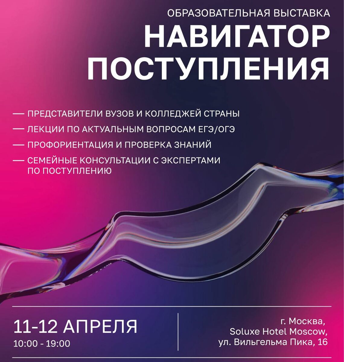 »! 11–12 апреля 2026 года пройдёт бесплатная семейная образовательная выставка — отличная возможность для школьников и родителей разобраться в вопросах поступления 🎓 Что вас ждёт: 🔹 информация о поступлении в вузы 🔹 тематические лекции от экспертов 🔹 разбор изменений в ОГЭ и ЕГЭ 2026 🔹 профориентационное тестирование 🔹 диагностика знаний 🔹 индивидуальные консультации 👨👩👧👦 Участие бесплатное для школьников и родителей ❗️Необходима предварительная регистрация по ссылке: https://nvgtr.ru/gr_msk2026 📍 Место проведения: г. Москва, ул. Вильгельма Пика, 16 Soluxe Hotel Moscow Не упустите возможность получить полезную информацию и сделать уверенный шаг к выбору будущей профессии 💡 📲 Следите за новостями школы в МАХ. #ДОНМ #Школа1400