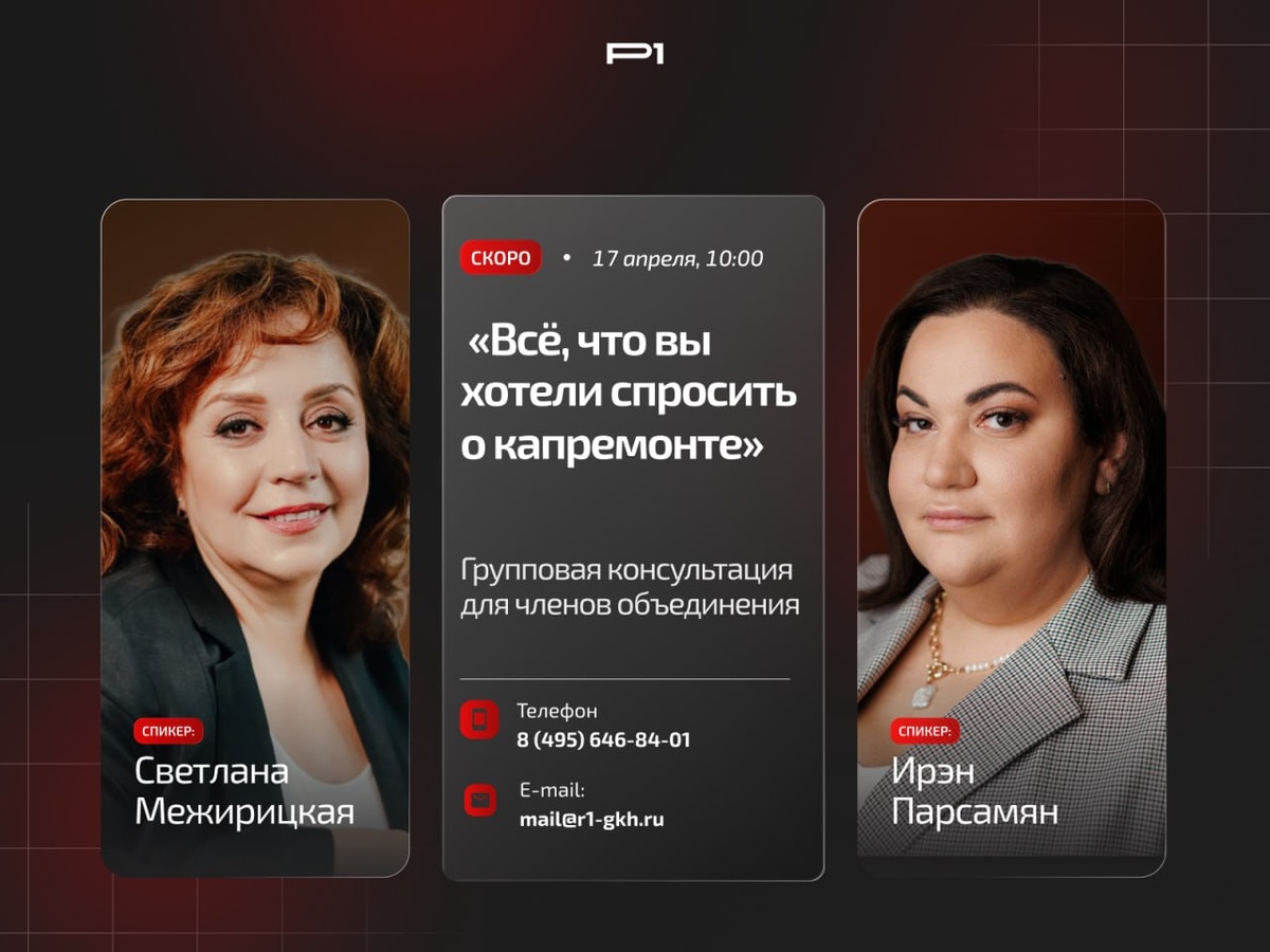 Уже в следующую пятницу, 17 апреля с 10:00 до 12:00 встретимся онлайн на групповой консультации для членов Ассоциации «Р1». 🔚 Тема месяца: «Всё, что вы хотели спросить о капремонте» со Светланой Межирицкой и Ирэн Парсамян. ✅ В новом формате обсудим: ▪️ формулировки повесток ОСС в разных ситуациях ▪️ подготовку к сезону капитального ремонта ▪️ использование накопленных средств ▪️ нестандартные кейсы и практические решения для УО и ТСЖ Ссылкой поделимся накануне. ⚠⚠ В этот же день Ирэн Парсамян проведёт индивидуальные онлайн-консультации. ➡️ Осталось 3 свободных окошка. Для записи обратитесь к @Association_R1. ❤️ Форматы доступны только для членов Ассоциации «Р1». Присоединяйтесь к сообществу
