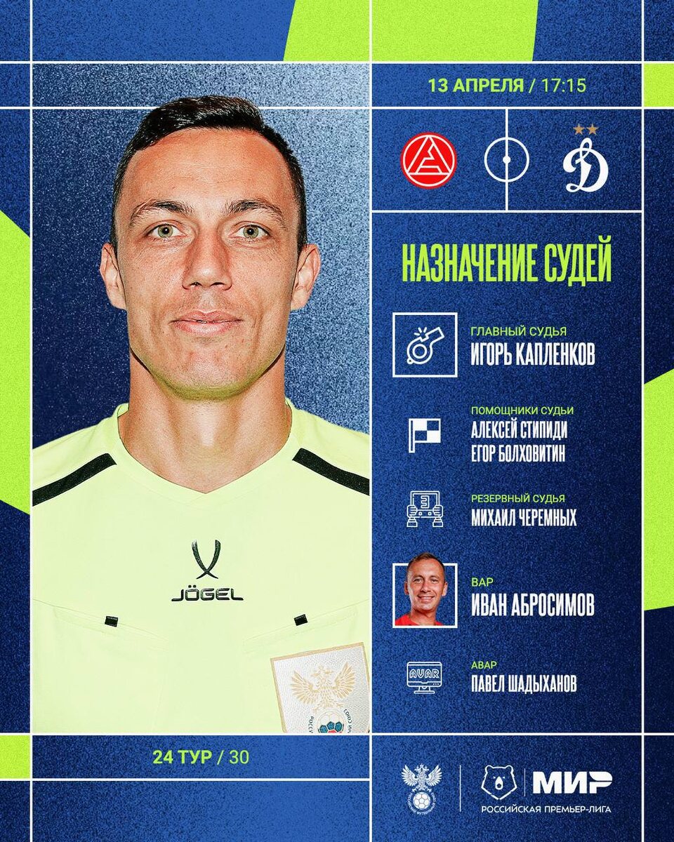 ? Игорь Капленков назначен главным арбитром матча 24 тура Мир РПЛ #АкронДинамо Ну а если серьезно, то в этом сезоне судил один матч РПЛ. Все остальное на фото. Судья на VAR — Иван Абросимов. Судил прошлый матч в кубке и отменил красную просто так. Матч покажут по платному каналу Матч Премьер. Комментаторы – Шнякин и самарский Коптев. Встреча начнется в 17:15. ⚽️ Подписывайтесь на БуДсу!