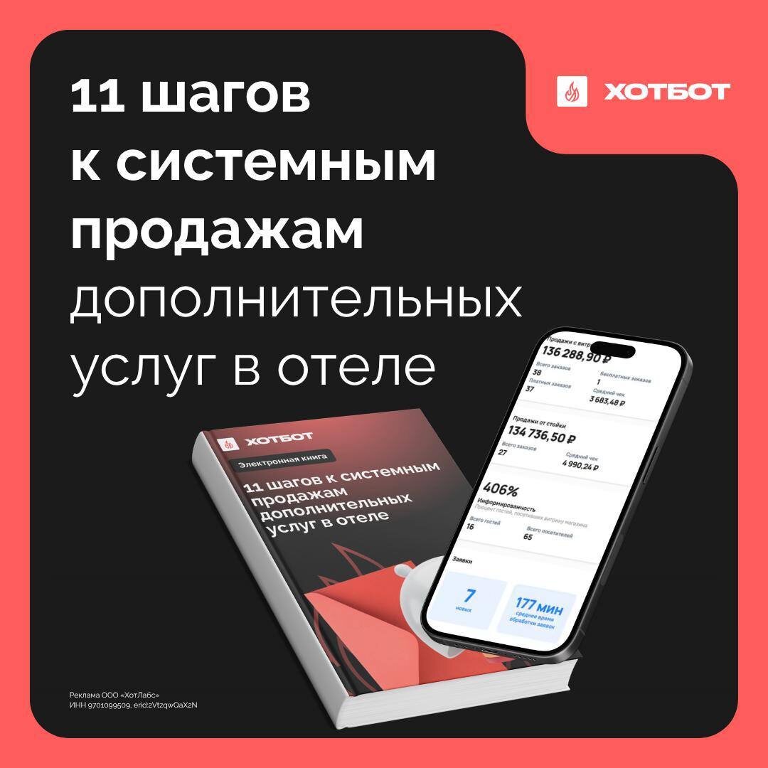 Проблема не в спросе. Гости просто не видят услуги, не доходят до покупки или узнают о них слишком поздно. Из-за этого отель теряет деньги буквально каждый день. Для того, чтобы это исправить, нужна система. Хотбот подготовил практический подход, который поможет к сезону навести порядок в продаже дополнительных услуг и не терять выручку там, где ее можно регулярно увеличивать. 🔔Запишитесь на бесплатный разбор с экспертом. За 30 минут разберем именно ваш отель, покажем точки роста, найдем слабые места в продаже доп.услуг и подскажем, что стоит поправить в первую очередь. 🎁В подарок вы получите книгу «11 шагов к системным продажам дополнительных услуг в отеле». Это 139 страниц, 4 главы, 11 шагов, инфографики, формулы и реальные кейсы, к которым можно возвращаться в работе. Книгу вы получите в любом случае. Но если прийти еще и на разбор, пользы будет в разы больше – вы не просто прочитаете материал, а сразу поймете, какие решения подходят именно вашему отелю, где у вас узкое мес