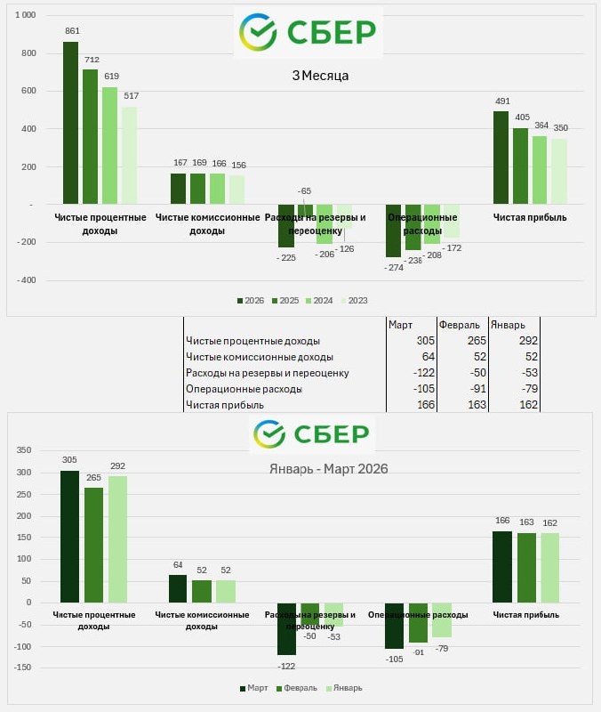 🏦 $SBER Сбер отчёт за 3 месяцев 2026 Очередной отчёт зеленого банка. Доходные статьи за 3М 2026 🔼 Чистые процентные доходы: +21% г/г 🔽 Чистые комиссионные доходы: -1% г/г 🔼 Чистая прибыль: +21% г/г ▫️ Рентабельность капитала 22,7% Расходные статьи 🔼 Расходы на резервы и переоценку +247% 🔼 Операционные расходы +15% У зеленого всё зеленое, но вот расходы на резервы - тревожный сигнал. По крайней мере за 4 года самое большое значение в натуральном выражении. Операционные расходы стабильно находятся на уровне 27% от чистых процентных и комиссионных доходов. Ждём отчёта по МСФО. С зелёным всё ясно в целом 🟢