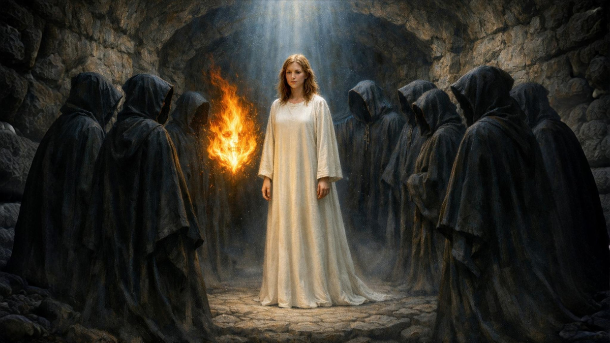 Процессия в чёрных накидках с капюшонами, идущая гуськом, — это не костюмированное шествие, а рабочая форма ордена, скрывающая лица посвящённых друг от друга. Лица не видно не потому, что Вы не запомнили, а потому что Вам и не полагалось видеть. Посвящаемый не должен знать, кто именно его посвящает, — это базовое правило закрытых школ того периода. А посвящаемой, Ольга, были Вы. Белая холщовая рубаха до пят — одеяние инициируемого, обозначающее чистоту поля перед тем, как в него будет внесён новый рисунок. Это одежда того, кто готов получить печать.