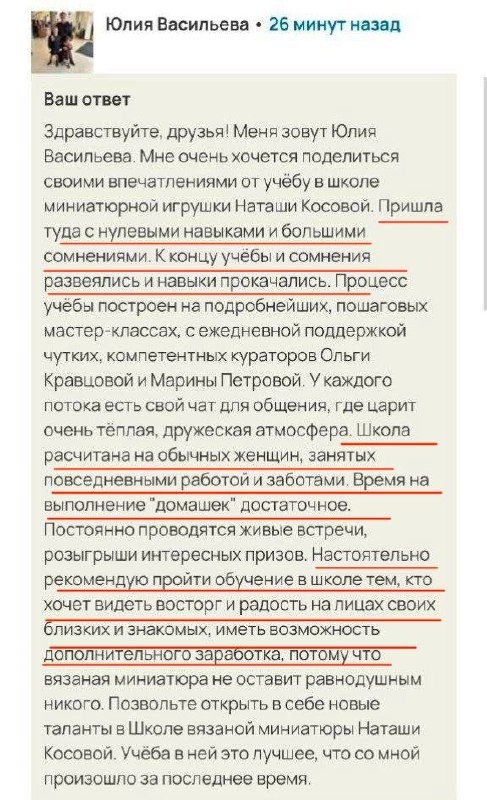 … «Но к концу программы и сомнения развеялись, и навыки прокачались.» Вот такой отзыв написала нам Юлия Васильева — и мы не можем не поделиться 🧡 Юлия рассказала о пошаговых мастер-классах, ежедневной поддержке наставников, тёплой атмосфере в потоке — и о том, что школа создана для обычных занятых женщин, у которых нет лишнего времени, но есть желание творить. И знаете что? Таких историй у нас много. Мы их публикуем тут 👉 ОТЗЫВЫ можно на досуге заглянуть и вдохновиться 😊 Если вы когда-то думали «хочу научиться, но с нуля — это же нереально» — этот отзыв для вас. Потому что Юлия тоже так думала. Пока не посмотрела эфир «Как вязать крючком миниатюрные игрушки и зарабатывать на этом». А потом пришла на полную программу «Миниатюра на основе вязаных элементов». Друзья, и вас мы приглашаем на этот бесплатный эфир 👉https://prominiature.ru/webgk?utm_source=tgkanal&utm_medium=post&utm_campaign=mini Расскажем о нашей методике создания миниатюрных игрушек, покажем как это работает — и п