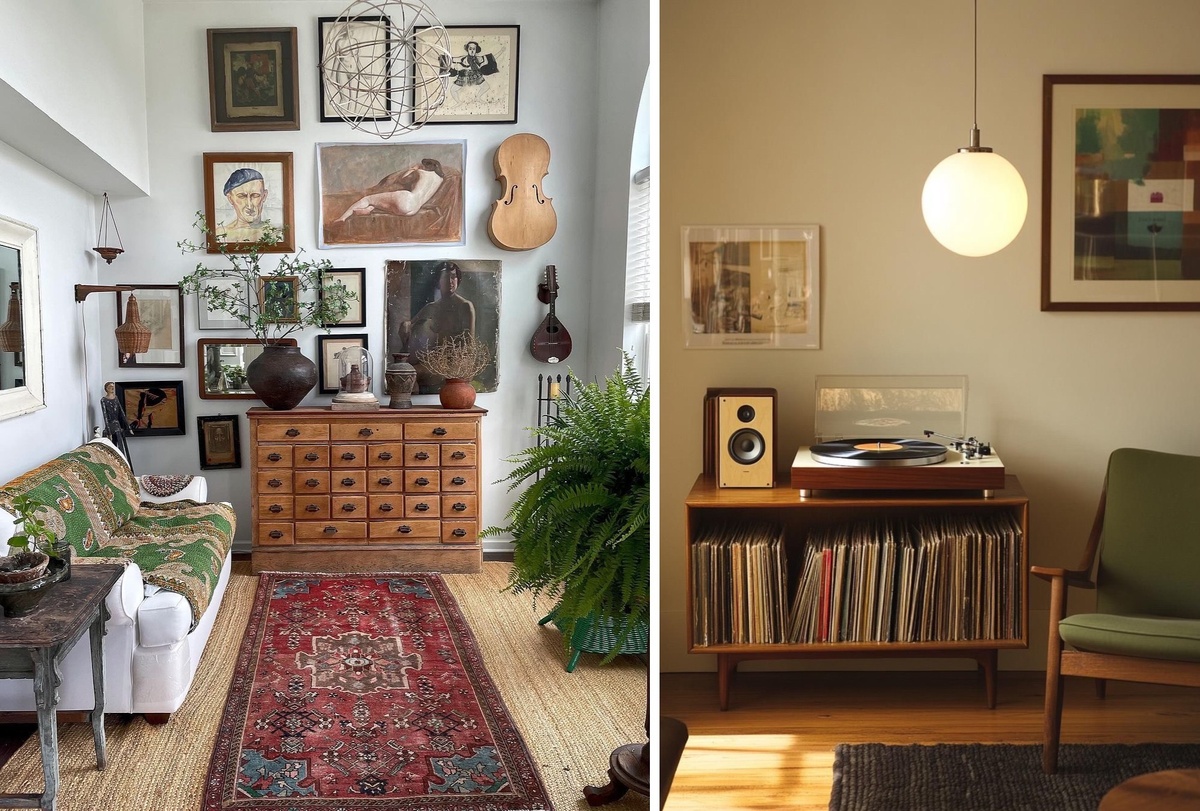 Ковры. В 90-е их убирали со стен, стеснялись. Теперь возвращают, и в правильном контексте они работают безупречно. Особенно ценятся советские ковры с геометрическим орнаментом или растительным узором в приглушённых тонах: терракота, мхово-зелёный, пыльная роза.