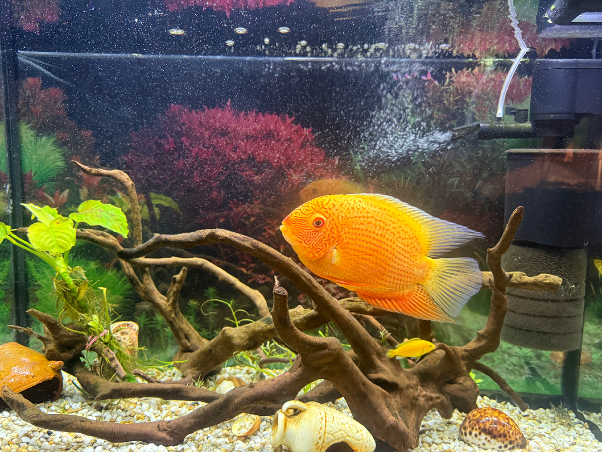 Сказано - сделано. Не сказать, что Конкордия сильно обрадовалась такому соседству, их она тоже начала гонять, но еллохи шустрые, легко уплывают от суровой тети Коры. Кстати, через пару дней одна из самок приобрела окрас самца. Видимо, когда они жили в малышатнике, другой самец доминировал, и этот решил от греха подальше притвориться самкой. Теперь альфы в банке нет, и он предстал во всей своей красе.