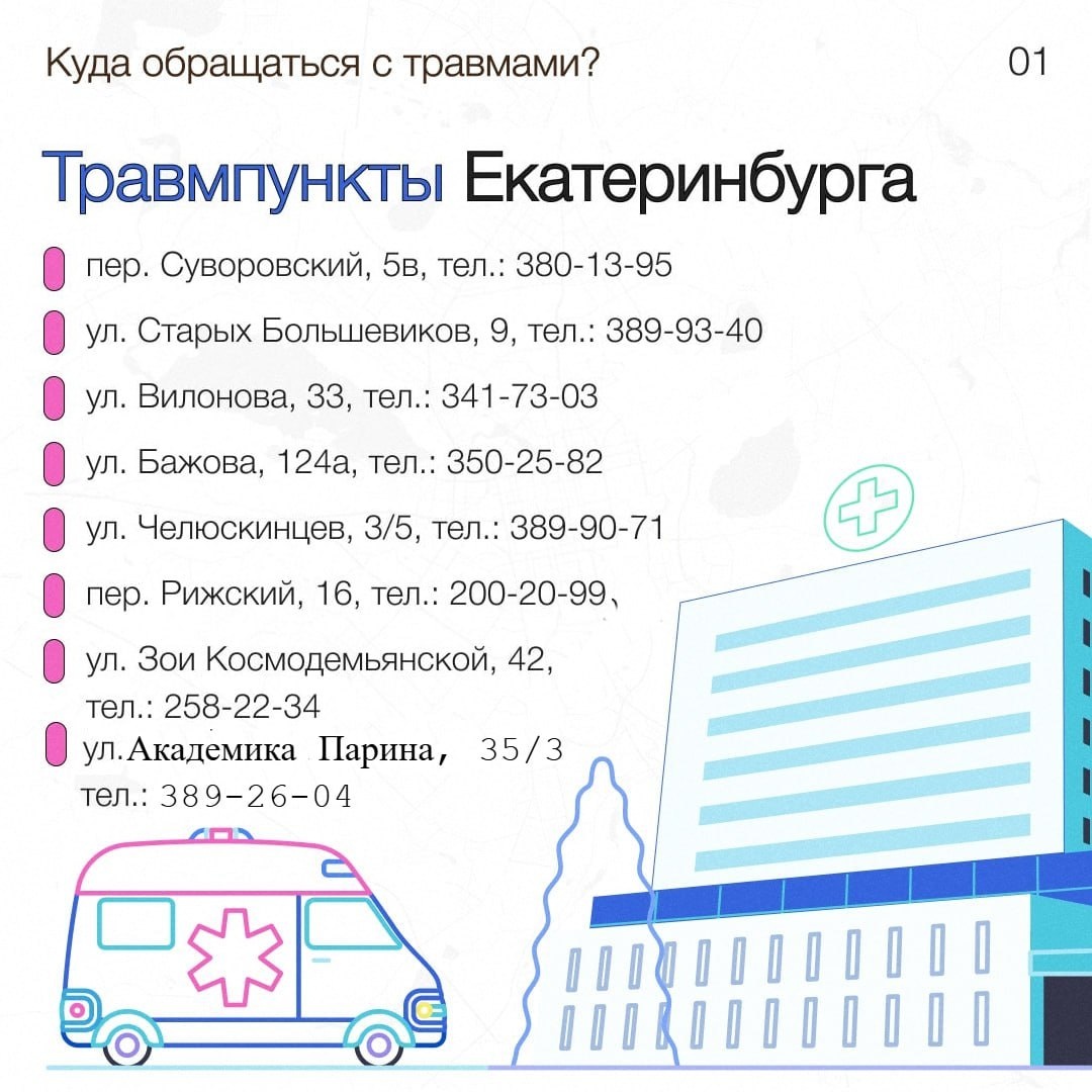 Да и не только там, снегодождь веселится на всей территории области. И если ты проигнорировал все сигналы ответственных лиц, зачем-то уже переобул машину, решил подрифтить на самокате, или просто оказался чуть менее везучим, чем обычно, этот пост для тебя. 🚑 Травмпункты: где получить помощь взрослым и детям В межсезонье у травматологов особенно много пациентов, которые поскользнулись, упали или получили ушибы. 💡 Никто не застрахован от травм, вызванных гололедом, непогодой или бытовыми происшествиями. Куда обратиться в случае беды? Ответ на этот вопрос вы найдете в наших карточках.