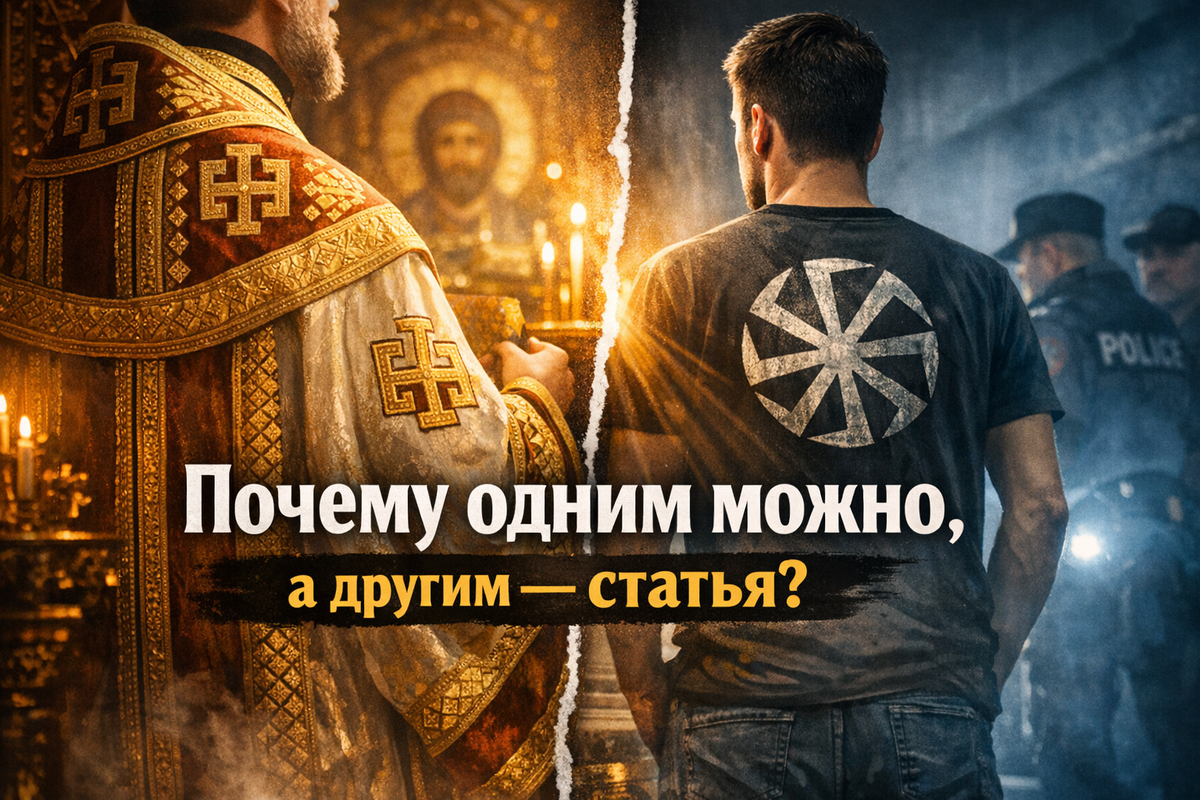 Православный священник надевает ризу с гамматическим крестом — и это воспринимается как благочестие, верность традиции и святость. Но стоит русскому человеку, который чувствует связь со своими дохристианскими корнями, надеть футболку с коловратом — и он тут же становится «экстремистом».