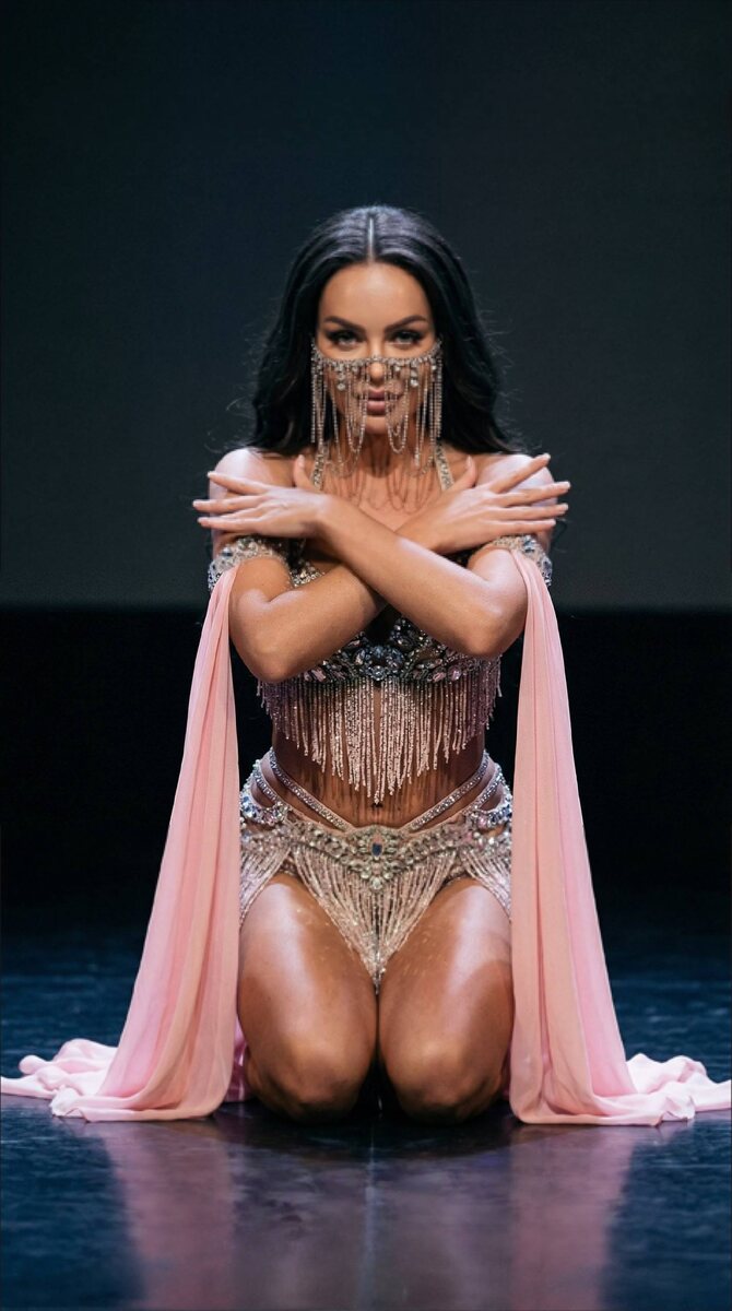 Зрелищный сценический образ в восточном костюме со стразами и бахромой, драматичный свет - из одного твоего фото ✨