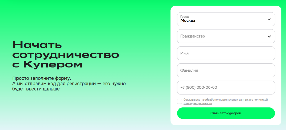 Чтобы устроиться курьером в Купер необходимо подать онлайн-заявку: