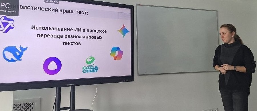 На кафедре иностранных языков и межкультурной коммуникации факультета гуманитарных и социальных наук МГУ имени А.И. Куинджи состоялось заседание студенческого научного общества «ФиЛ», центральной темой которого стала роль искусственного интеллекта в переводческой деятельности. Основой для обсуждения стал доклад старшего преподавателя кафедры иностранных языков и межкультурной коммуникации Валерии Вадимовны Чебурахиной. 📊 В своем докладе Валерия Вадимовна рассмотрела современные системы машинного перевода. По представленным данным, они уже показывают высокую точность при работе с техническими текстами, договорами и новостями. Алгоритмы учитывают не только отдельные фразы, но и общий стиль текста, подбирая подходящие формулировки. В ходе обсуждения участники сошлись во мнении, что искусственный интеллект активно входит в сферу переводческой деятельности. Он помогает быстрее обрабатывать большие объемы информации, готовить черновые переводы и работать с терминологией. При этом его возмо