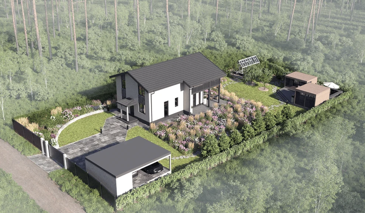 В процессе проектирования были поддержаны линии и пластика дома через ландшафт, сохранён естественный уклон и выстроена понятная структура участка. Парковка на два автомобиля интегрирована в общее пространство так, чтобы оставаться удобной, но не доминировать визуально. В основе концепции - сад как “место притяжения”, где можно замедлиться, отдохнуть и провести время с семьей.
