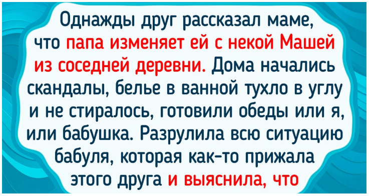 - Когда я была ребенком, к нам в гости часто захаживали папины друзья. Мама всегда накрывала красивый стол, хоть это было порой и затратно. Но однажды один папин друг рассказал маме, что папа изменяет маме с некой дояркой Машей из соседней деревни, поэтому и задерживается после работы. У мамы и так самооценка не была высокой, а тут и вовсе упала. Дома начались скандалы, белье в ванной тухло в углу и не стиралось, готовили обеды либо я, либо бабушка. Разрулила всю эту ситуацию, собственно, бабуля. Узнав от знакомого, что за папой никаких грехов не наблюдается, она поехала к папиному другу. Как-то прижала его и выяснила, что друг оговорил папу из зависти, в чем тот сам признался. У друга ни с женой ничего не ладилось, ни дома порядка не было, вот он и отыгрался.