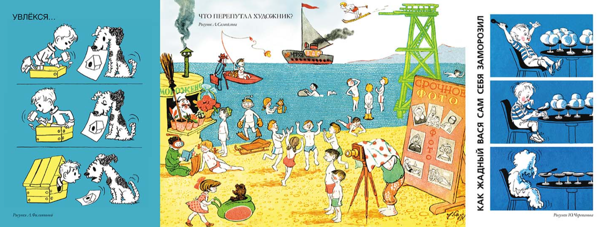 Приготовили для вас волшебный телепорт в прошлое, и объявляем минутку ностальгии! Давайте вернемся к тому, что радовало нас, когда мы еще пешком под стол ходили. В нашем издательстве "Мелик-Пашаев" есть два прекрасных сборника, "Девочка Маша, кукла Наташа и все-все-все" и "Сладкоежка и все-все-все", которые мы просто обожаем, потому что они составлены из лучших материалов знаменитого советского журнала "Веселые картинки". Под их обложками сценки, головоломки, стихи, игры и рассказы, которые много лет назад придумали и нарисовали для малышей знаменитые детские художники: Каневский, Васнецов, Ротов, Конашевич, Сутеев, Чижиков и многие другие. Сегодня мы составили подборку из забавных стихов, историй в картинках и даже задачек-головоломок, которые будет интересно вспомнить вам, взрослым, а еще занятно посмотреть и вашим малышам: посмеяться, разгадать загадки художника, выучить простые рифмы. Итак: Нажимайте на картинки - они откроются в большем размере, и все будет хорошо видно! Посмотрет