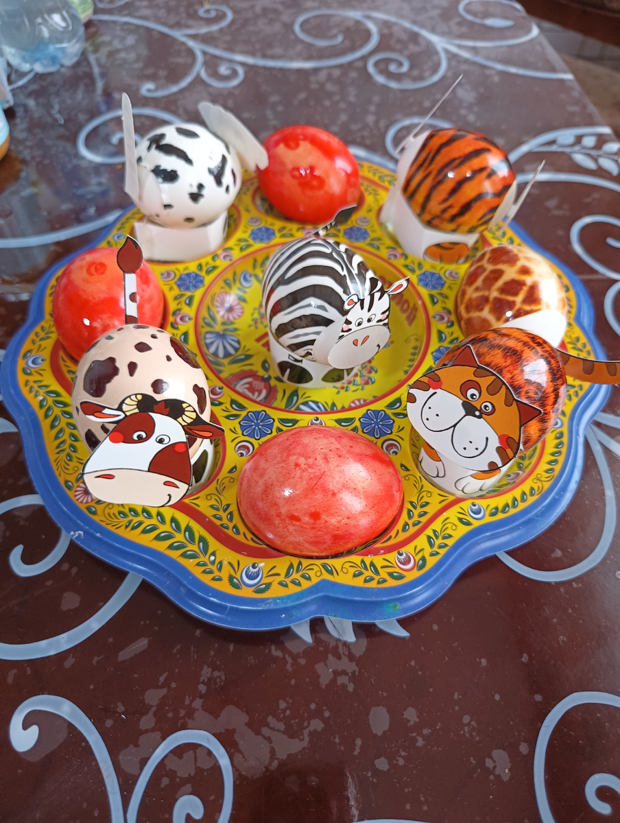 Еще я покупала наклейки для яиц. Интересные такие: термонакоейка в виде шерсти животного, а голова и хвост на двусторонний скотч крепятся. Ноги в виде подставки для яиц сделаны. Ну это вообще рай для Амелии. Сева не захотел делать. Ему уже надоело.