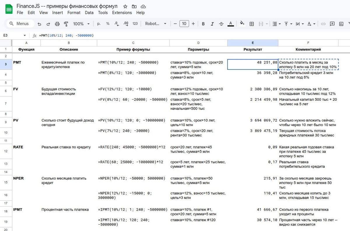 Это набор финансовых функций в стиле Excel: PMT, IRR, NPV, RATE, PRICE, YIELD и ещё штук 30. Всё на чистом ESM, без зависимостей, с JSDoc-типами. Каждая функция -- отдельный файл, импортируешь только то, что нужно. Результаты совпадают с Excel до 8 знаков после запятой. Прикольно, что можно проверять прямо в Google Sheets -- берёшь те же параметры, вставляешь в формулу и сравниваешь. Удобно для тестирования и для понимания, как эти формулы вообще работают. А если нужно что-то кастомное в таблицах -- те же формулы можно перенести в Apps Script, логика один в один. Сколько платить в месяц за ипотеку 5 млн на 20 лет под 10%? Сколько накопишь за 10 лет, откладывая 10 тыс/мес под 12%? Одна формула -- один ответ. Собрал примеры расчетов прямо в таблице: https://docs.google.com/spreadsheets/d/11jqwuCojEXDNBDJFIxCW0W4euCEprqtnITDQdRBPVok/edit Если считаете деньги в коде -- стоит посмотреть. github.com/travishorn/financejs