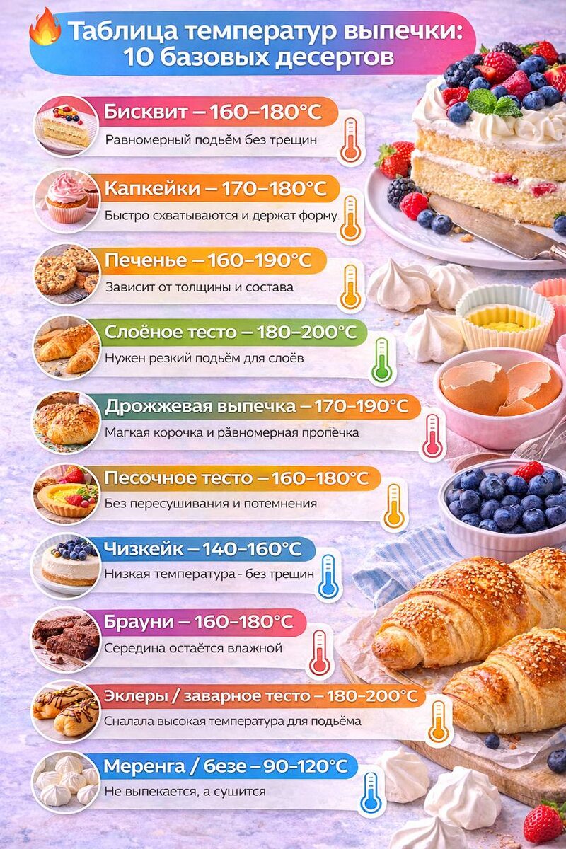 Чтобы десерты получались стабильными, важно не только соблюдать рецепт, но и правильно выставлять температуру. Сохраняй шпаргалку: 🍰 Бисквит — 160–180°C Равномерный подъём без трещин 🧁 Капкейки — 170–180°C Быстро схватываются и держат форму 🍪 Печенье — 160–190°C Зависит от толщины и состава 🥐 Слоёное тесто — 180–200°C Нужен резкий подъём для слоёв 🍞 Дрожжевая выпечка — 170–190°C Мягкая корочка и равномерная пропечка 🥧 Песочное тесто — 160–180°C Без пересушивания и потемнения 🍮 Чизкейк — 140–160°C Низкая температура — без трещин 🍫 Брауни — 160–180°C Середина остаётся влажной 🍩 Эклеры / заварное тесто — 180–200°C Сначала высокая температура для подъёма 🥮 Меренга / безе — 90–120°C Не выпекается, а сушится 🛍 Наши товары на Ozon и Wb