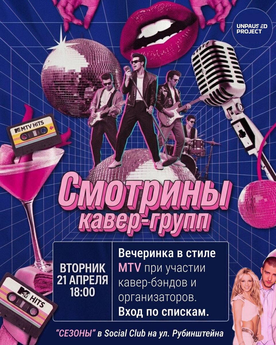 📣 Запускаем пушечку! СМОТРИНЫ ДЛЯ КАВЕР-БЭНДОВ 21 апреля | Сезоны Social Club Вечеринка в формате MTV. Берём глиттер и готовимся танцевать под Sexy Back! Что вас ждёт: • Живой звук, атмосфера MTV • Шоу-кейсы кавер-бэндов (по 6 минут на сцене) • Welcome-drink + фуршет • Нетворкинг в крутой атмосфере с организаторами и event-специалистами Твой лучший способ провести 21 апреля и приобрести полезные знакомства в потрясающей атмосфере. Как попасть: Вход для организаторов свободный (по спискам🤍) Для кавер-бендов есть орг.взнос. Организаторы: Unpaused project Площадка: Social Club Билеты: 1000 рублей. Пиши: @i_am_mangoboy Места сильно ограничены. Вход по спискам! 🚪 Сбор в 18:00 | 21 апреля