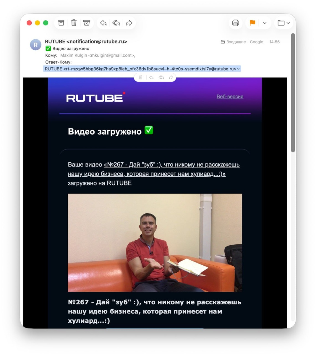 Письмо пришло, RuTube наконец перенес (автоматом) мое видео с YouTube, которое я выкладывал ±3 назад
