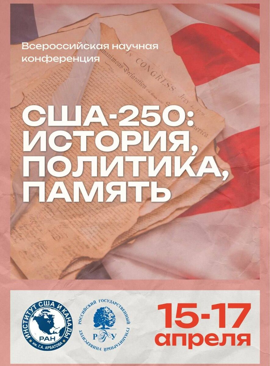 15-17 апреля 2026 г. Институт США и Канады им. Г.А. Арбатова совместно с Российским государственным гуманитарным университетом проводят Всероссийскую научную конференцию «США-250: история, политика, память».