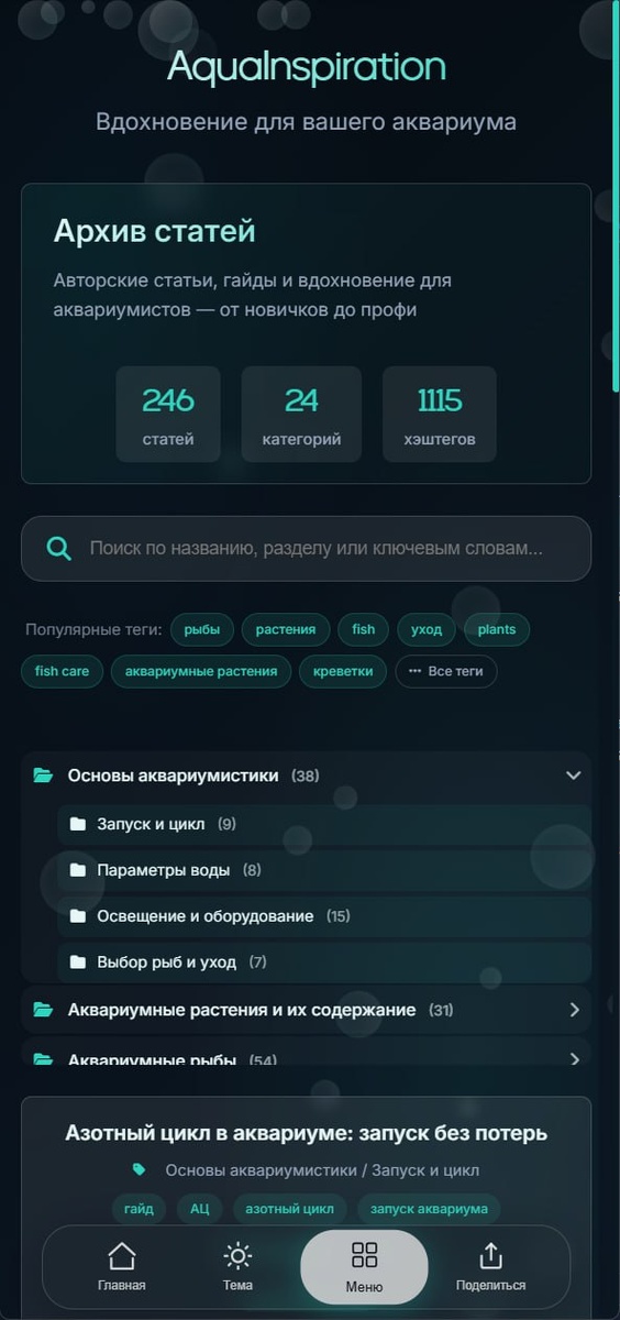 - Во многих местах доработан дизайн - Починил вывод новостей с Телеграм канала. Для тех кто не может зайти в ТГ, новости дублируются в наш МАХ канал. - Добавил модуль статей - И еще куча всего о чем уже и не помню :) 🌐 https://aquainspiration.ru 🌐 Канал в МАХ https://max.ru/join/8o7xUseH9jW6Db-f9mnEt99hnV4_w-ijn3LvXHPXMxA Если данные не обновились, нужно почистить кеш в рабочем браузере