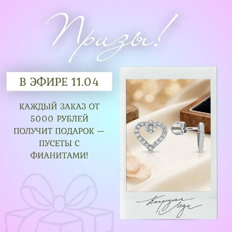 ✨ Скидки 30–50% распространяются даже на весенние новинки. Действуют только во время трансляции, не пропустите! 🎁 Каждый заказ от 5000 рублей получит подарок — пусеты с фианитами. 📅 Завтра, 11 апреля, в 13:00. Подключайтесь, будет красиво и очень выгодно! 💌 Памятка по заказам в прямых эфирах: vk.cc/cTpshd VK | MAX