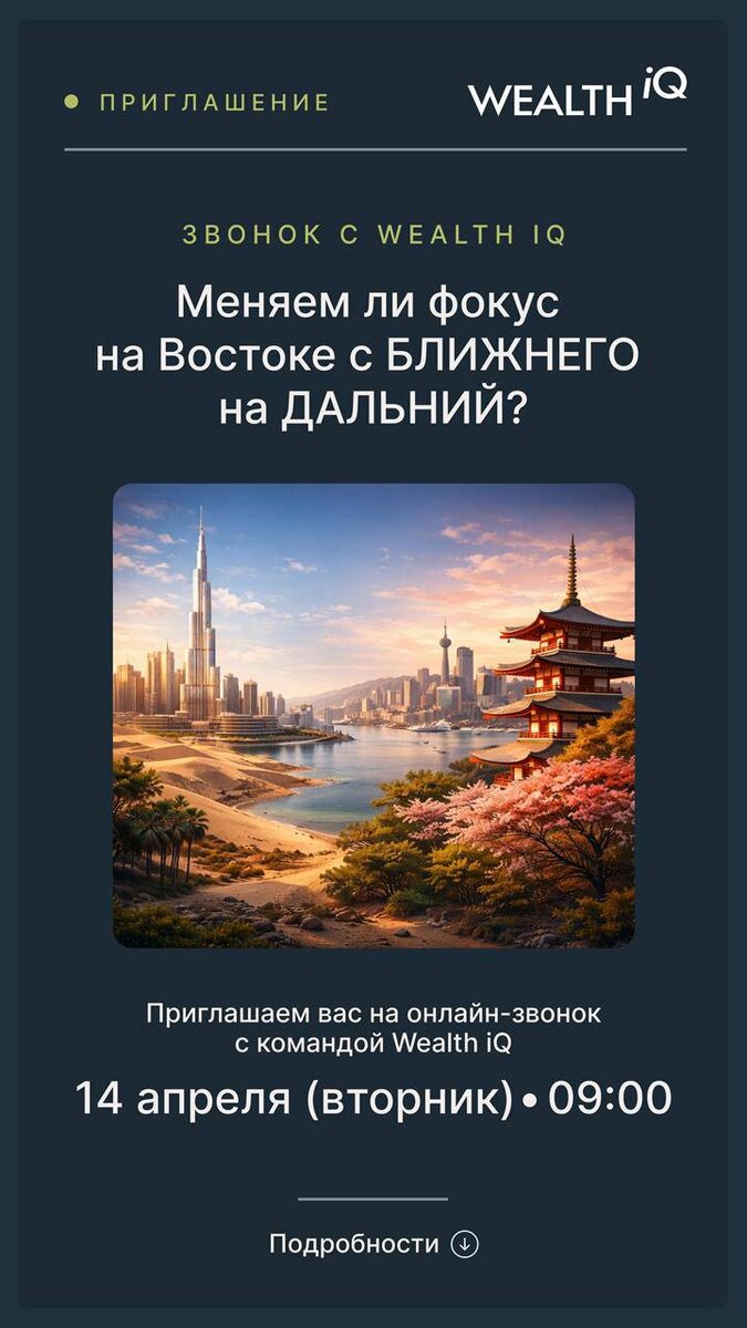 на Востоке с БЛИЖНЕГО на ДАЛЬНИЙ? Во вторник приглашаем вас на онлайн-встречу с командой Wealth iQ. О чем поговорим 🔘Ситуация на Ближнем Востоке: наша практика, мнения аналитиков и участников рынка, запросы клиентов. 🔘Реакция мировых рынков на ситуацию на Ближнем Востоке. Возможные сценарии и ожидания. 🔘Недвижимость Дубая во время шока: сделки, девелоперы. А также новые направления в фокусе. 🔘Какие юрисдикции могут стать альтернативой. Гонконг, Сингапур: что ждет там российских инвесторов. Спикеры ▪️Кирилл Комаров — директор по аналитике Wealth iQ ▪️Георгий Качмазов — основатель, управляющий партнер Tranio Group (ОАЭ) ▪️Вероника Жукова — исполнительный директор Wealth iQ Когда: 14 апреля в 09:00 Где: онлайн по ссылке https://us06web.zoom.us/j/87377049891 Регистрироваться не нужно. Можете просто добавить встречу в свой календарь. Для этого нажмите на ссылку и откройте ее в браузере. В день проведения обязательно напомним о вебинаре в нашем канале. Увидимся! #wealth 🏦 Wealth i
