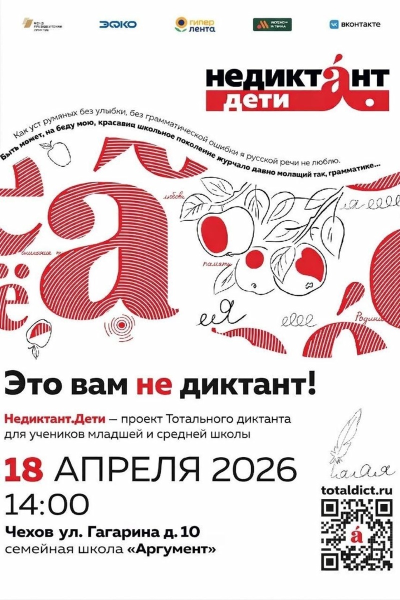 »! Ребята 1-8 классов, это ваш шанс попробовать себя в необычном формате по русскому языку - без скуки и стресса 🙌. Не диктант… а настоящее приключение: 🧩 загадки 🧠интересные задачи 💬игра со словами и смыслами. Это часть международного проекта, где можно почувствовать себя участником большого образовательного движения 🌍. Когда: 18 апреля в 14.00. Где: семейная школа «Аргумент», Чехов, ул. Гагарина д. 10. ‼️ Обязательно зарегистрируйтесь заранее на сайте. Количество мест ограничено! https://events.totaldict.ru/venues?cityId=3 Но если вдруг не получилось зарегистрироваться, всё равно приходите! Мы поможем зарегистрироваться на месте и всё спокойно пройдём вместе 🤍. Приходите с детьми, пусть они пробуют и исследуют русский язык по-новому и просто проводят время с пользой и интересом ✨ Наш телефон для любых вопросов: 8-910-000-86-26.