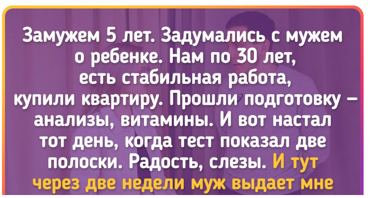 Замужем 5 лет. Задумались с мужем о ребенке. Нам по 30 лет, есть стабильная работа, купили квартиру. Прошли подготовку — анализы, витамины. И вот настал тот день, когда тест показал две полоски. Радость, слезы. И тут через две недели муж выдает мне, что нужно отложить рождение детей. Несколько дней я ревела, потом собрала вещи и уехала к маме. Подаю на развод.