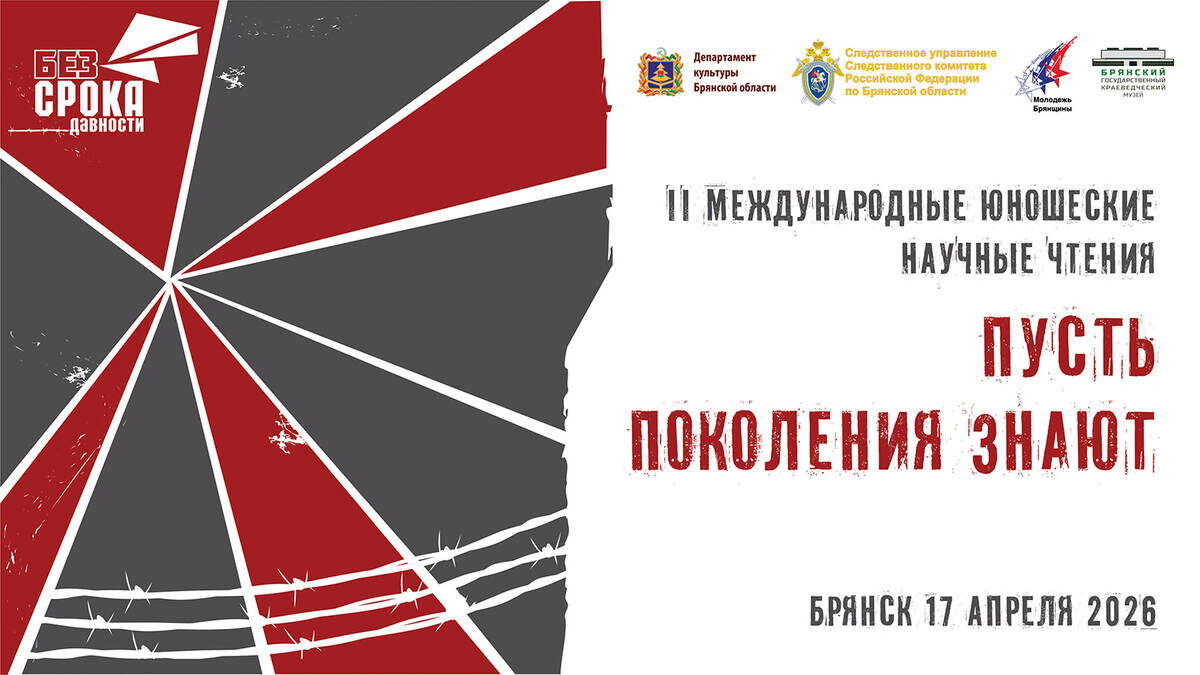 17 апреля в брянском краеведческом музее состоятся международные юношеские научные чтения «Пусть поколения знают». Регистрация участников начнётся в 10:00, начало - в 11:00. Выступят молодёжь Брянской области и Беларуси (часть выступлений - онлайн). Ребята представят свои научные работы о геноциде советского народа в годы Великой Отечественной войны. Чтения проводятся уже во второй раз и приурочены ко Дню памяти жертв геноцида советского народа. Главная цель - сохранить историческую правду и показать молодёжи, что нацизм в любом виде неприемлем. Среди почётных гостей - представители Молодёжных парламентов Брянской и Могилевской областей, Следственного комитета, прокуратуры, департамента культуры и других ведомств. 6+