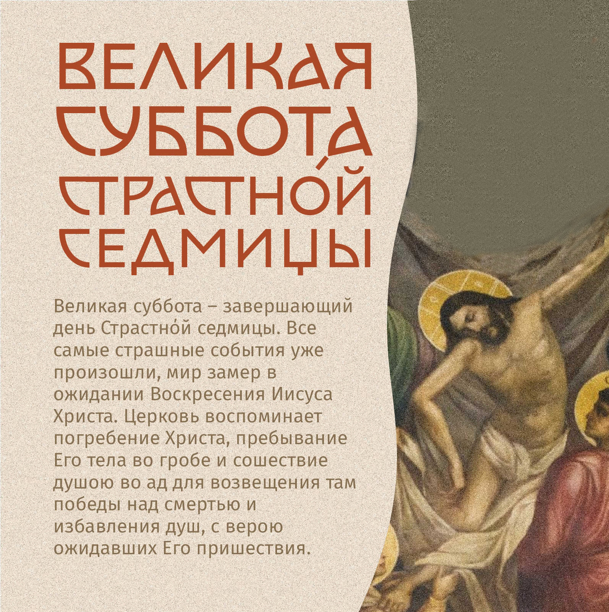 Великая суббота – завершающий день Страстнόй седмицы. Все самые страшные события уже произошли, мир замер в ожидании Воскресения Иисуса Христа. Церковь воспоминает погребение Христа, пребывание Его тела во гробе и сошествие душою во ад для возвещения там победы над смертью и избавления душ, с верою ожидавших Его пришествия. Подробнее рассказали в карточках: