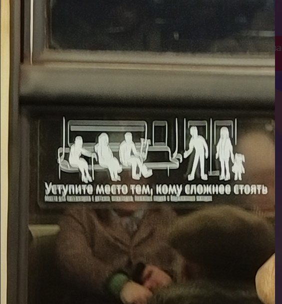 Всем привет! Уступите место тем, кому сложнее стоять. Казалось написано грамотно. Ошибок нет! Но беда в том, что происходит незаметное перестроение культуры Русских. Эта фраза буквально обозначает, садись кто хочет.... И уже нет уважения в Пенсионерам, инвалидам и беременным женщинам. Но это лишь первый шаг к снятию этой таблички совсем... Всё работает по системе окна Овертона. Народная культура, тоже не исключение. Хочешь уничтожить нацию, начни с их языка и их культуры...