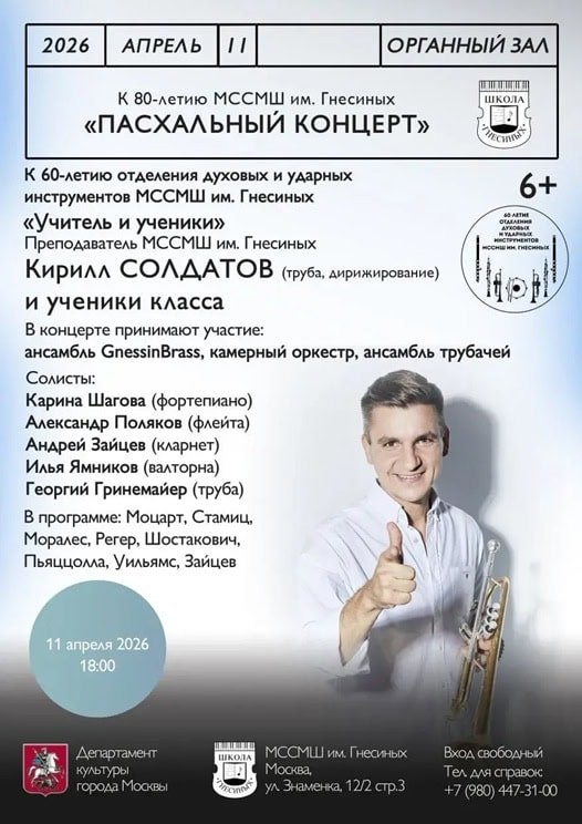 Гнесиных трубач Кирилл Солдатов выступит вместе с учениками 60 лет — это не просто дата, а важнейшая веха в истории Духового отделения МССМШ им. Гнесиных. Пасхальный концерт-посвящение «Учитель и ученики», который состоится 11 апреля 2026 в Доме на Знаменке, откроет череду юбилейных торжеств. https://www.classicalmusicnews.ru/anons/soldatov-gnesinka-2026/?utm_source=cmn_own&utm_medium=telegram 🎼 ClassicalMusicNews.Ru | Telegram | ВК | МАКС