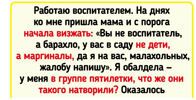 Работаю воспитателем. На днях ко мне пришла мама и с порога начала визжать: «Вы не воспитатель, а барахло, у вас в саду не дети, а маргиналы, да я на вас, малахольных, жалобу напишу». Я обалдела — у меня в группе пятилетки, что же они такого натворили? Оказалось, что лапочка-дочка, по словам мамы, в садике научилась ругаться. И вот орет она на меня, аж красная от натуги, и искренне верит в то, что все эти слова, которыми она меня щедро поливает, дочка в песочнице узнала, а не от нее.