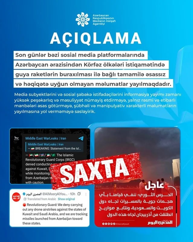 ‼️ MEDİA опровергло заявления о запуске ракет с территории Азербайджана.