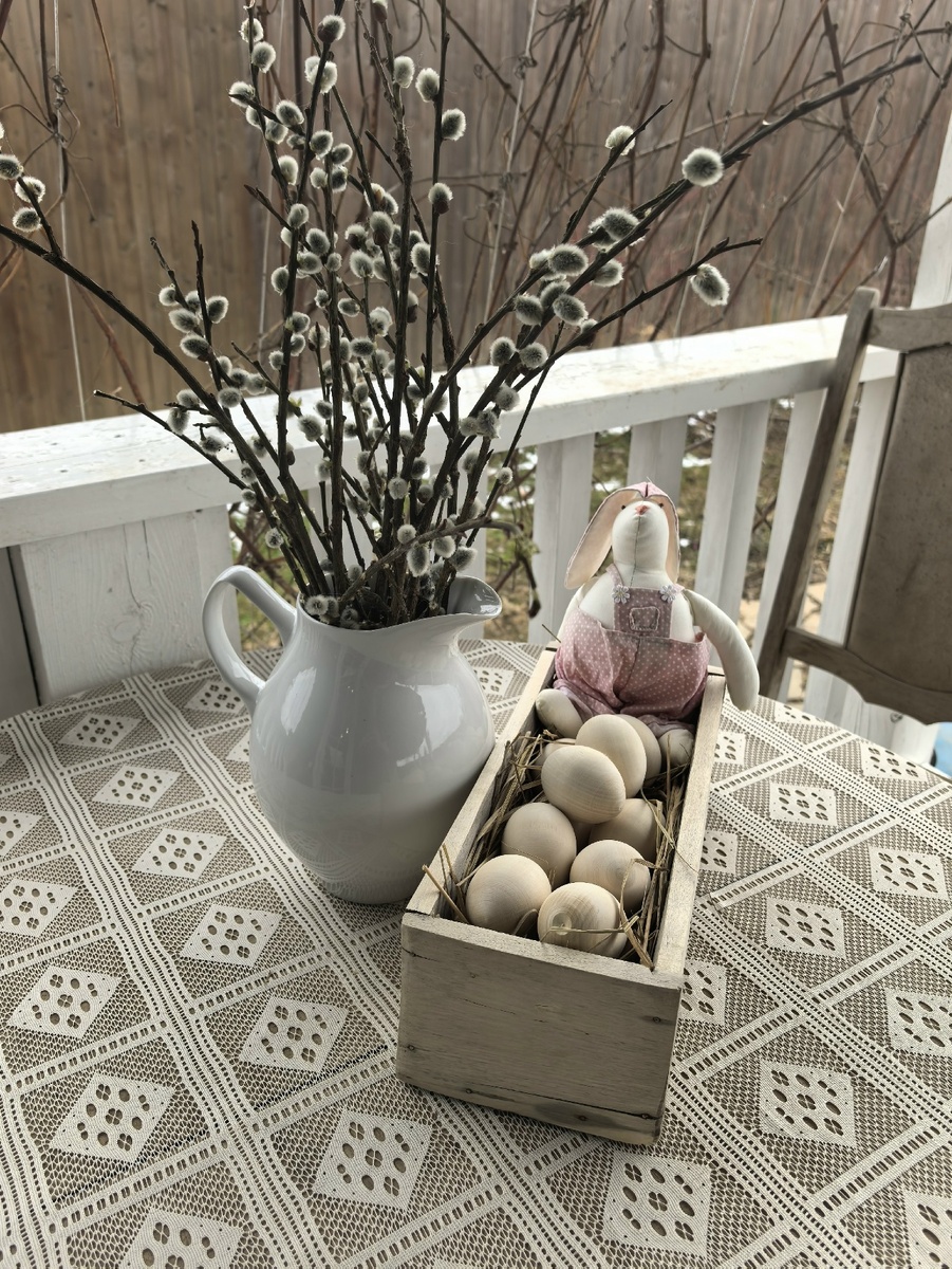 Пока тесто для кулича поднимается, мы с Катей Третьей занялись украшением дома. Повесили пасхальный венок на дверь; на стол на терраску постелили новую скатерть (Дед на 8-е марта подарил) и поставили ветки и ящичек с пасхальным зайкой и яйцами; на сундуке в гостиной устроили «гнездо». С яйцами у меня в этом году вышла незадача, а точнее я просто не собралась вовремя их до ума довести. Обычно и в ящичке с пасхальным зайкой, и в «гнезде» я использую настоящие варёные яйца. А нынче решила купить деревянные, чтобы каждый год обыкновенные не тратить. Купить купила, а покрасить не удосужилась. Так и лежат они у меня сейчас чисто деревянные. Если всё по-доброму, то на следующей неделе всё-таки покрасим. Баллончик с белой краской есть, припрятан где-то. А подписчица Анна поделилась своей красотой. Она посадила в яичную скорлупу траву и горох. Всё взошло, и обалдеть как красиво и свежо получилось. Я сразу загорелась повторить такое у себя, но поняла, что не выйдет. Во-первых, шаловливыми лапам