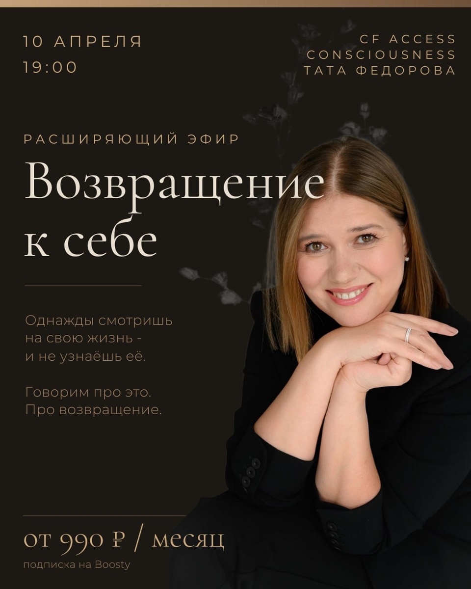 Справляешься, принимаешь решения, несёшь ответственность, живёшь в этом ритме, где остановиться - значит потом разбирать ещё больше. И в какой-то момент это становится фоном. Напряжение, которое уже даже не замечаешь. Но вместе с этим уходит ещё кое-что. Ощущение себя. Лёгкость. Понимание, чего ты хочешь на самом деле. И тогда возникает простая, но непривычная вещь - вернуться к себе. Не через усилие. Не через «надо». А через разрешение остановиться и услышать. 🤍 Сегодня, 10 апреля в 19:00 мск я проведу эфир «Возвращение к себе» в https://boosty.to/fedorovacf/streams/video_stream?share=post_link Для уровня «выдох» - участие онлайн, живое присутствие (990₽). Для уровней «Сдвиг» и «Новая реальность» - останется доступ ко всем записям. Если ты чувствуешь, что устала держать всё на себе - это пространство, где можно начать отпускать. Позволь себе открывать новое, получать больше и увидеть, что тогда станет возможным.