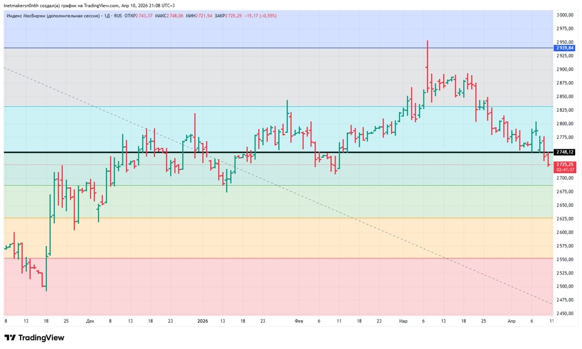 ❗️10 апреля российский фондовый рынок завершил рабочую неделю в “красной зоне”, индекс МосБиржи подешевел на 0,29% до уровня 2725,39