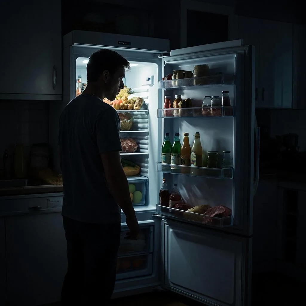 — Представьте себе, весь день ни крошки в рот не взял, голодал честно. А ночью просыпаюсь посреди ночи от странного звука. Открываю глаза, смотрю — дверь холодильника медленно открывается сама собой!