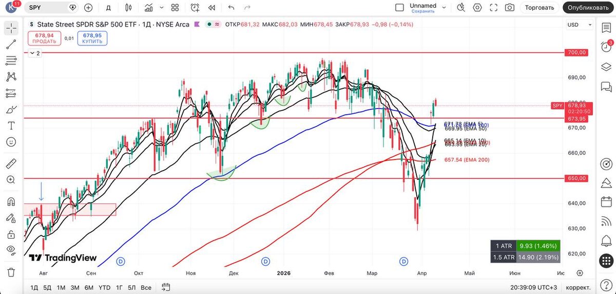 В данный момент наблюдаем слабость в ротационных отраслях $DIA и $RSP, а значит, увидим снижение широты, а снижение широты практически никак не отразится на $SPY = хороший знак. После позитива на фондовом рынке видим позитив и на остальных рынках, в частности в крипте. $BTC пытается закрепиться выше быстрых скользящих, однако остальные скользящие сверху могут выступить временным сопротивлением. И опять же, задайте себе вопрос: где сейчас находятся $SPY и $BTC относительно своих исторических максимумов? Кто быстрее всех восстанавливается? Просто идеальная почва для работы! Спокойно провожаем рынок на выходные. Всем отличных выходных 😎 #spy #технический_анализ #америка #трейдинг_сша #фондовый_рынок #обзор #вывод #qqq #vix #smh #mags #xlk #ixic #крипта #btc