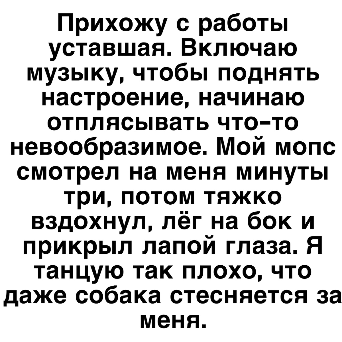 Прихожу с работы уставшая. Включаю музыку, чтобы поднять настроение, начинаю отплясывать что-то невообразимое. Мой мопс смотрел на меня минуты три, потом тяжко вздохнул, лёг на бок и прикрыл лапой глаза. Я танцую так плохо, что даже собака стесняется за меня.