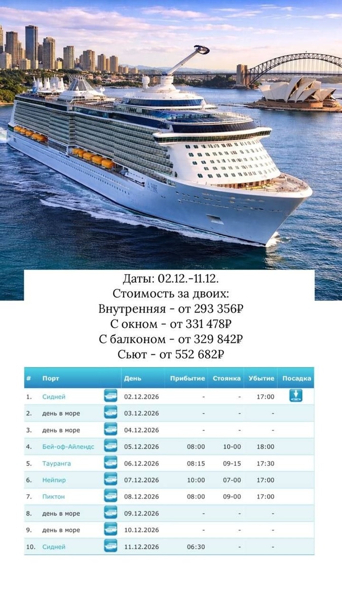 🌊✨ 📍Маршрут: 🇦🇺Сидней - яркий портовый город с атмосферой большого путешествия🌆 🇳🇿Бей-оф-Айлендс - бирюзовые бухты и мягкая природа Новой Зеландии🌿 🇳🇿Тауранга - солнечные пляжи и лёгкий курортный ритм ☀️ 🇳🇿Нейпир - город в стиле арт-деко, будто из открытки🎨 🇳🇿Пиктон - ворота к живописным фьордам и заливам🏞️ и обратно в Сидней✨ 🍽️В стоимость уже включены питание, развлечения, безалкогольные напитки и портовые сборы - всё для комфортного отдыха без забот⚓ #Австралия #топкруизы #НоваяЗеландия ❤️Ваш океан эмоций уже совсем близко!🌊 +7 918 999-02-47 📱Top_Tour 📱ВКонтакте